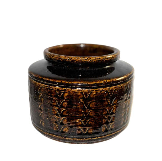 Palshus stentøjs marmaladekrukke, udført i grøn harepelsglasur, Danmark 1960erne