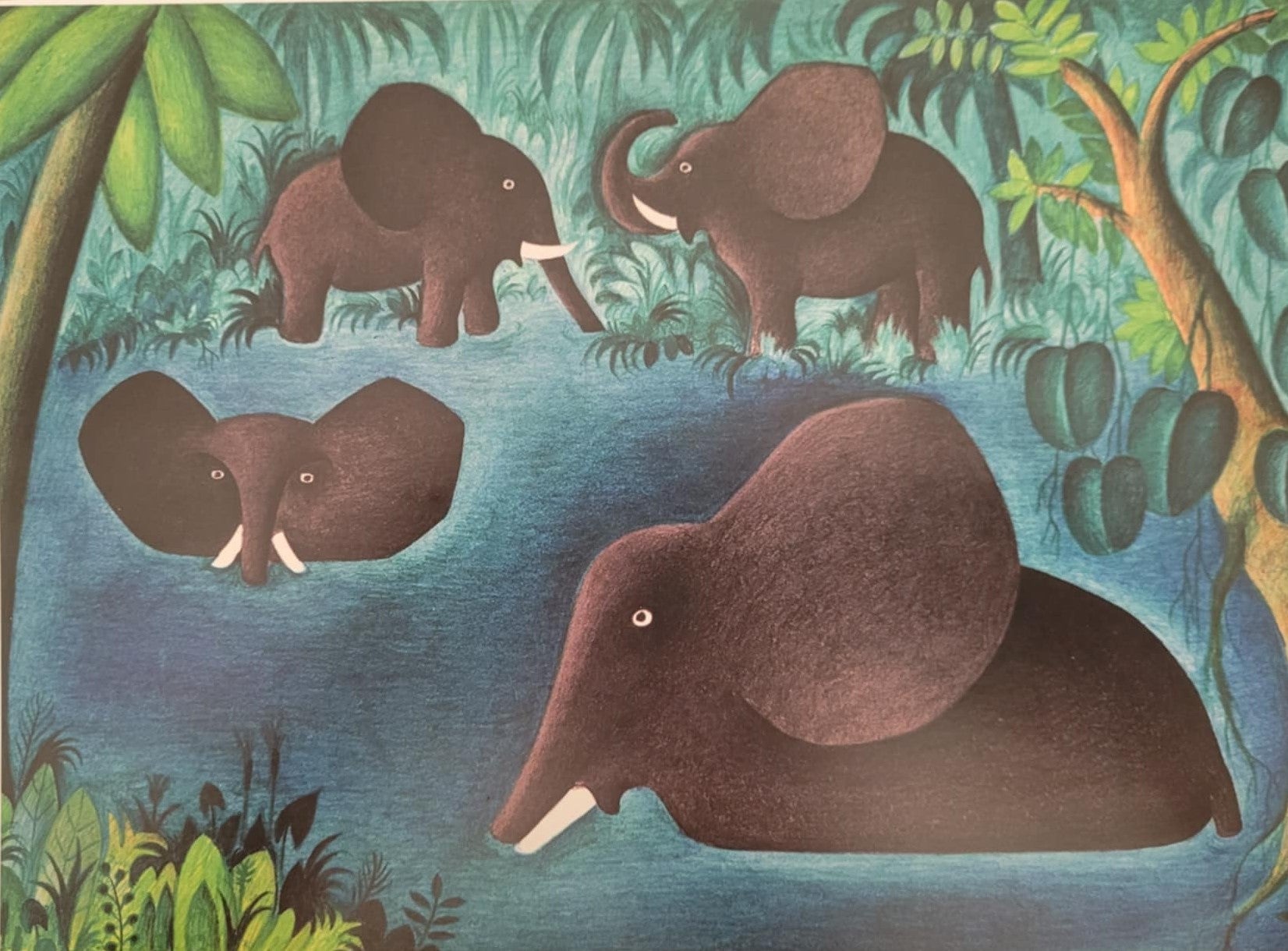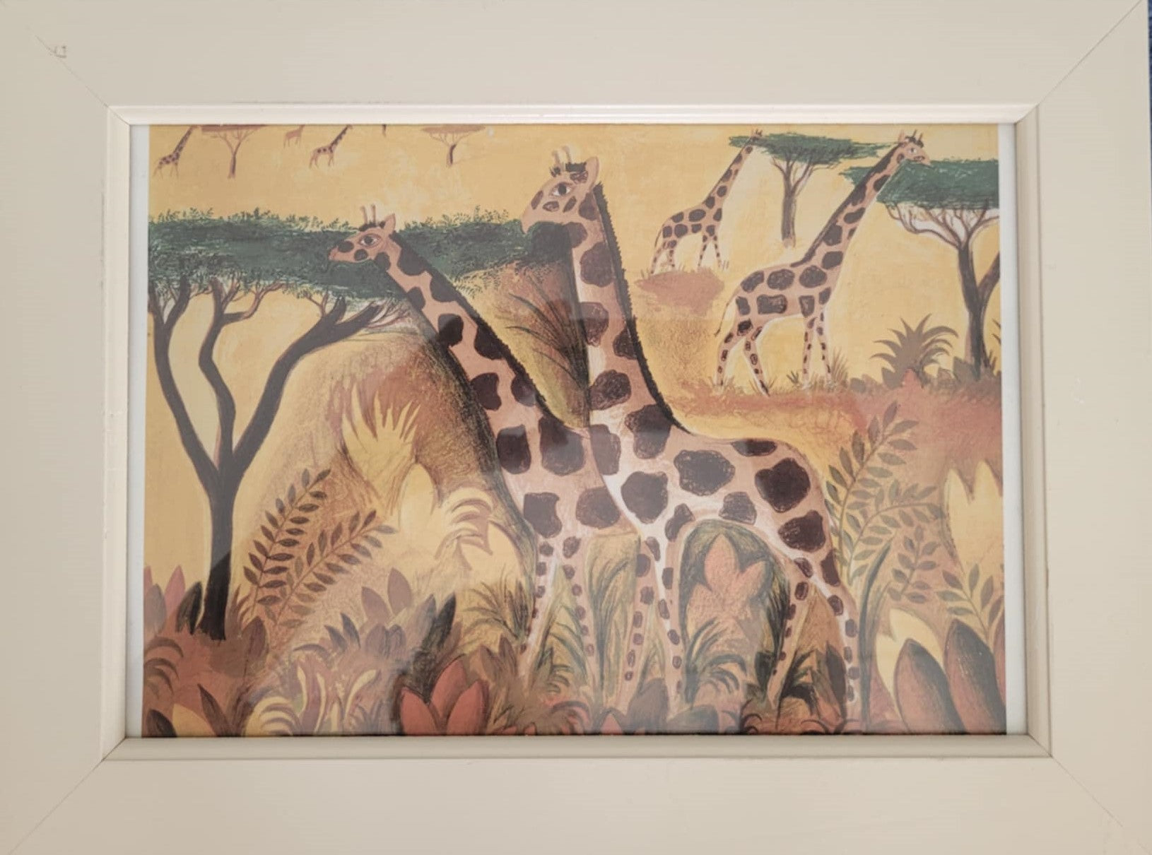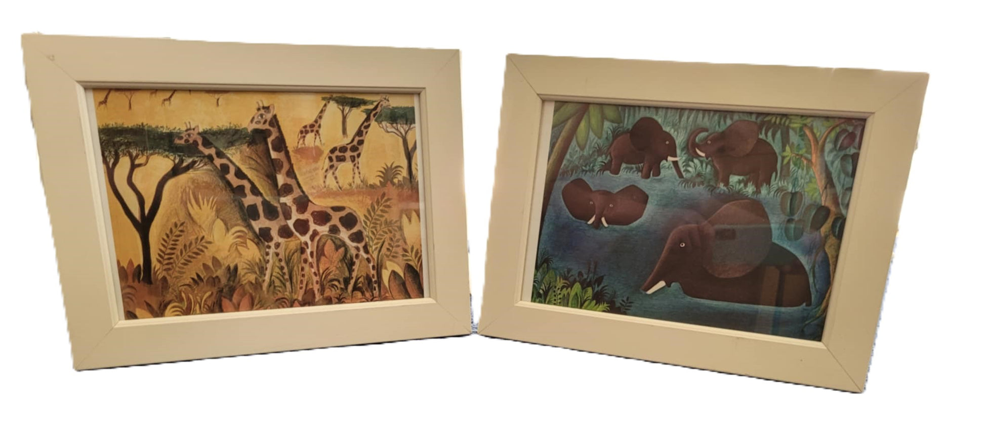 2 flotte indrammede offset tryk af Hans Scherfig - Badende Elefanter 1975 og 7 Giraffer 1964