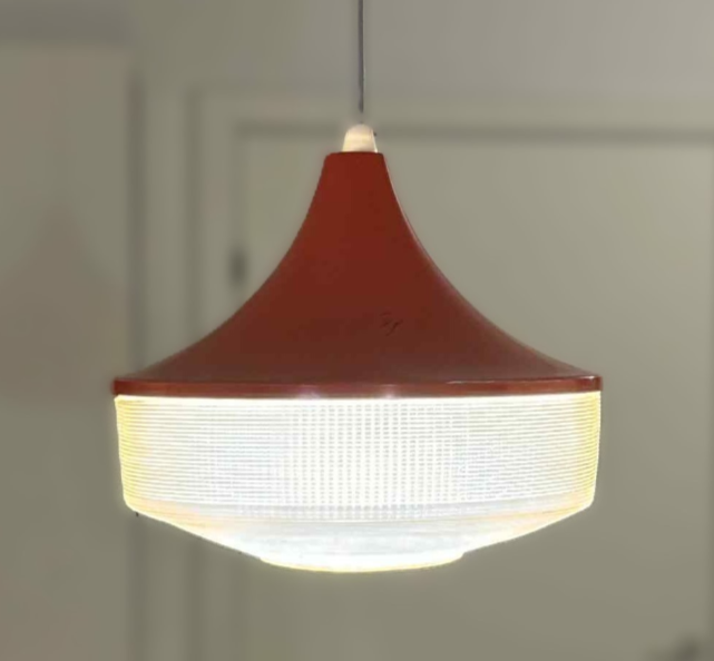A rare Rotaflex pendant from the 50s. The Rotaflex lamps were produced and designed by Yahsa Heifetz, France. The brand was one of the first movers on plastic lamps in the 50s, and made lamps from "ribbons" of plastic - which is what gave the lamps the special and beloved surface. This model is pretty unique, as it has a red metal shade on top of the plastic