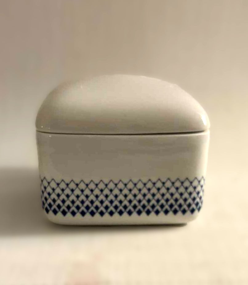 Glat hvidt porcelæn med dekoration af mørkeblå romber