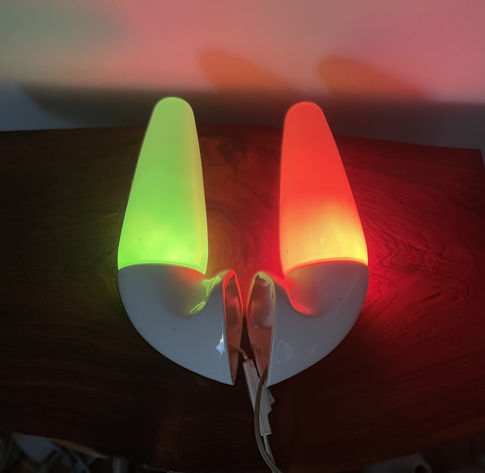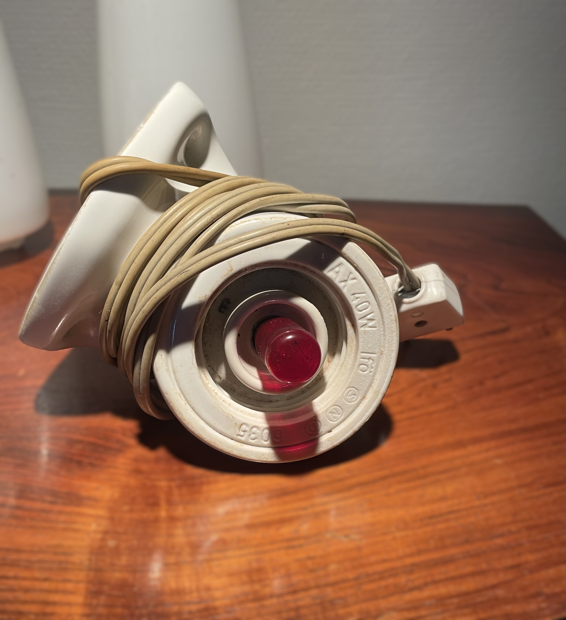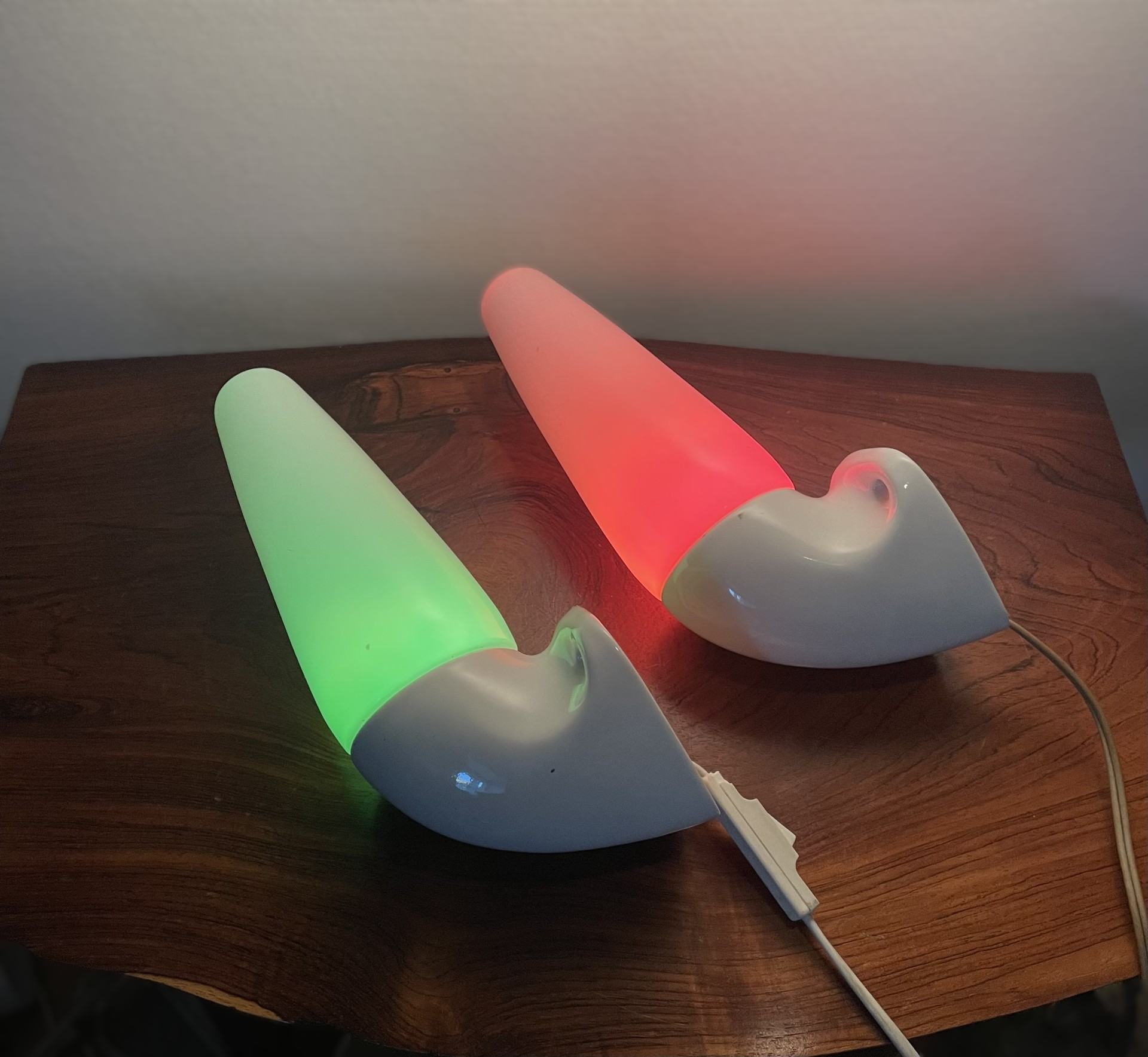 Sigvard Bernadotte design: 1 par Ifo væglamper i hvidt porcelæn og glas, og med farvede pærer (kan udskiftes).