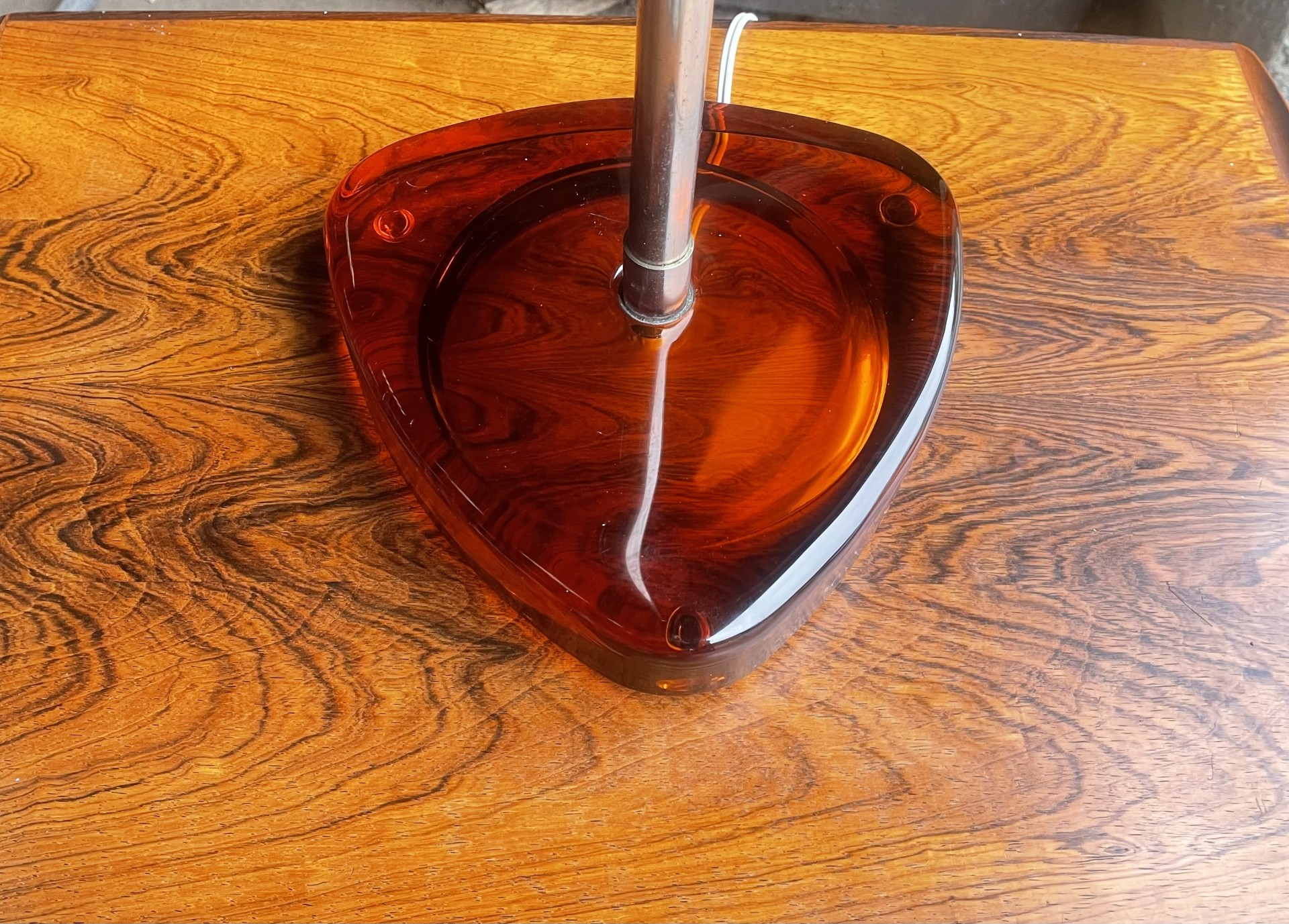 Standerlampe med glas base og forkromet stamme (muligvis Carl fagerlund fra Orrefors ), er dog ikke mærket.