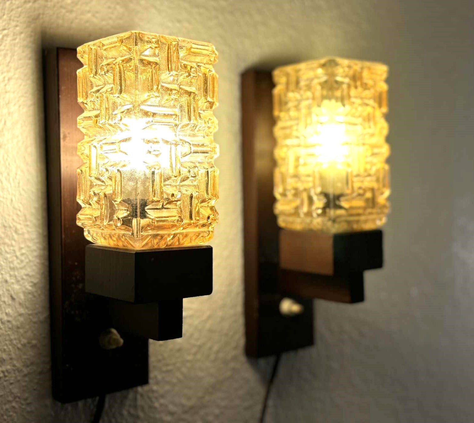 Vitrika Denmark, stained Pine wood and glass sconce set, set of two wood and thick sculptured glass sconces, midcentury Danish design.